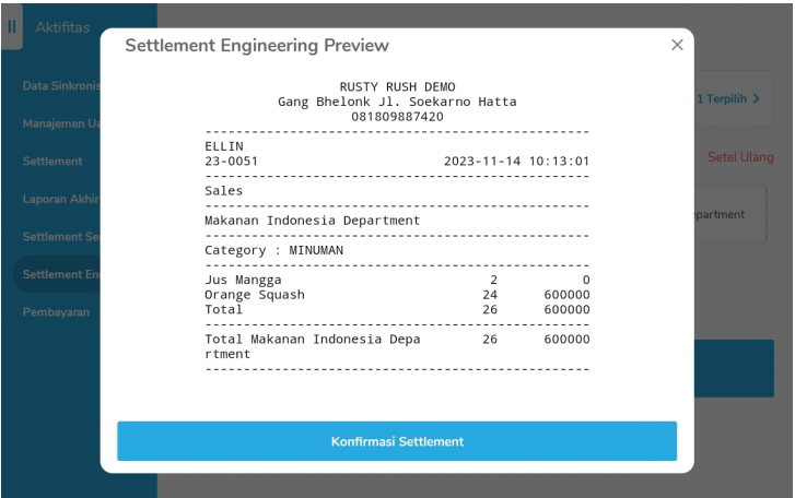 Pada versi terbaru ini, jika user menggunakan pengaturan settlement dengan Preview, maka user akan melakukan input nominal uang tunai pada halaman Pratinjau Settlement, seperti berikut: