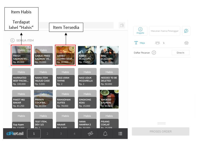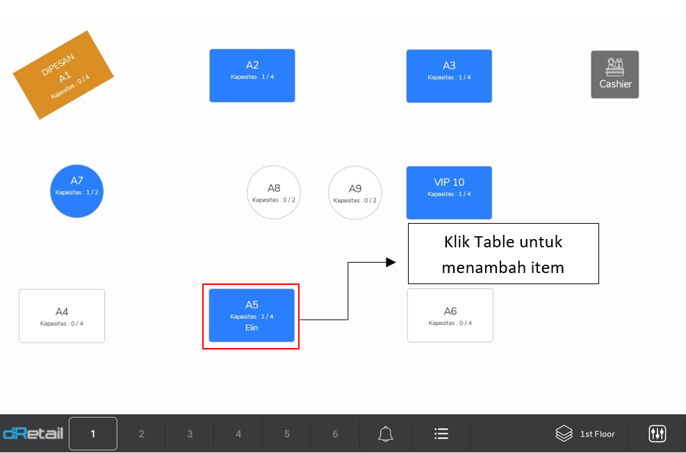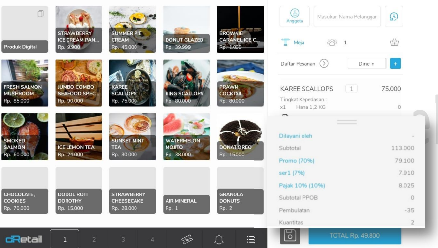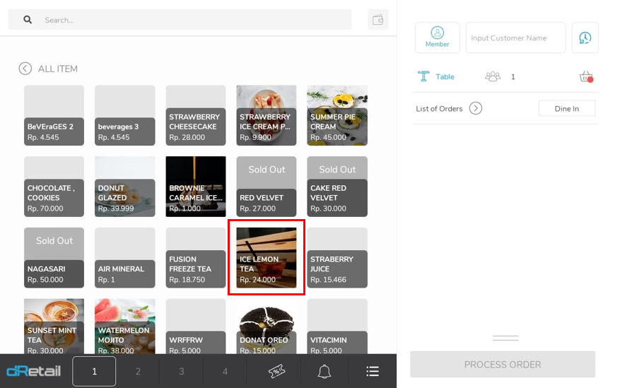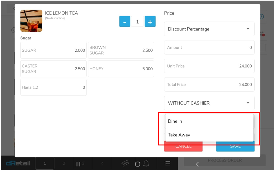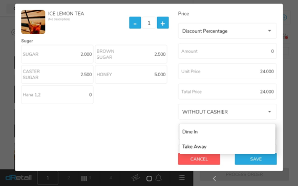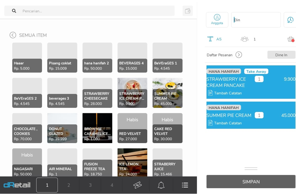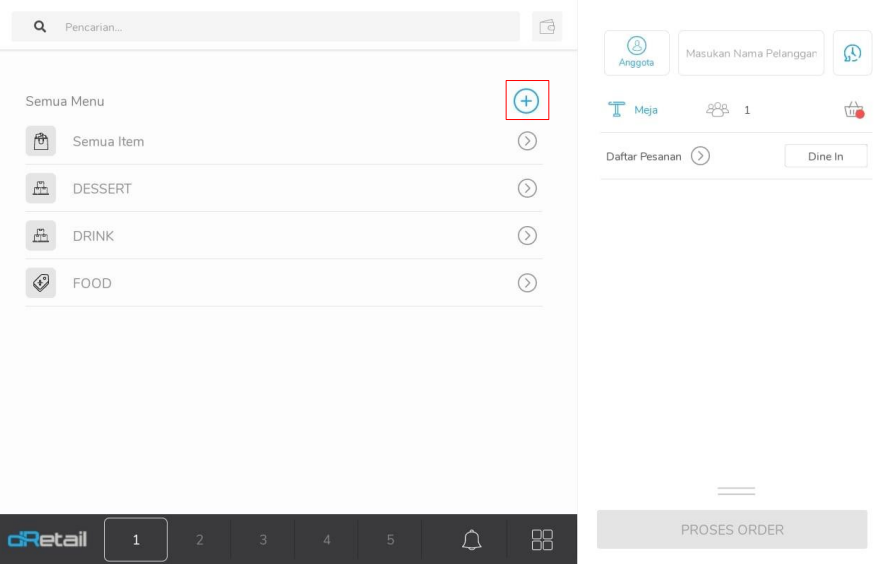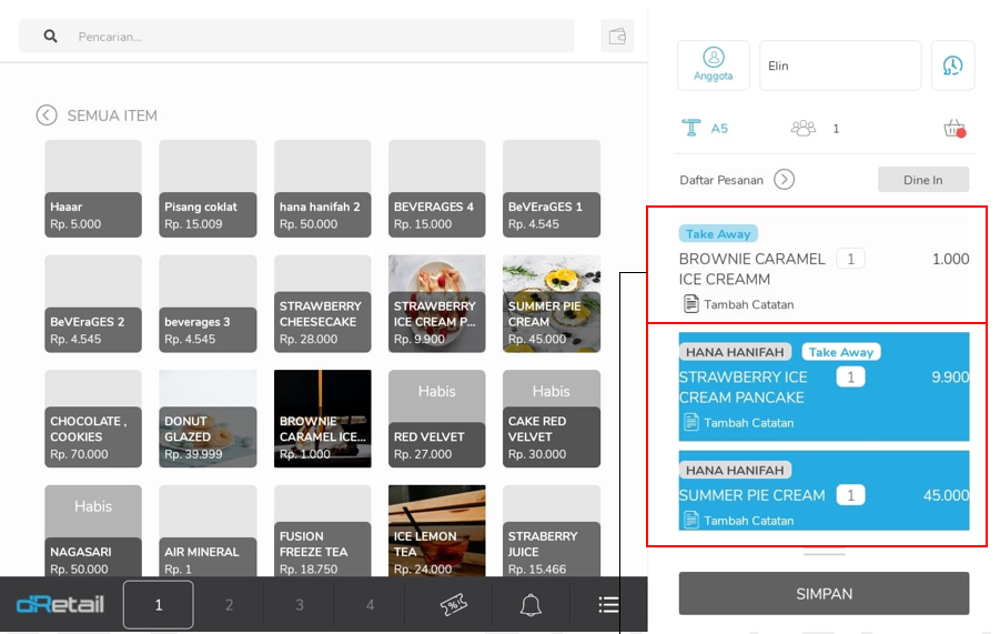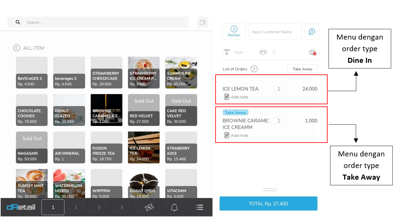Klik Dine in untuk mengubah tipe order