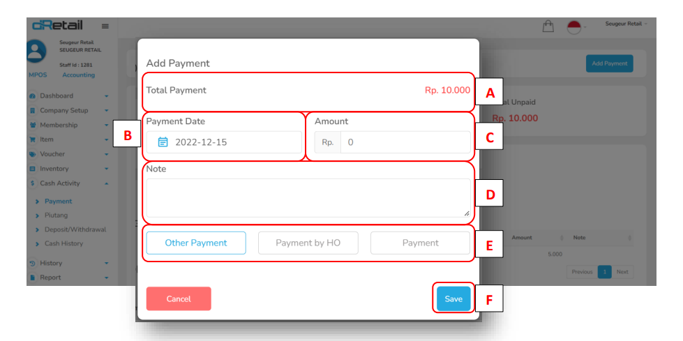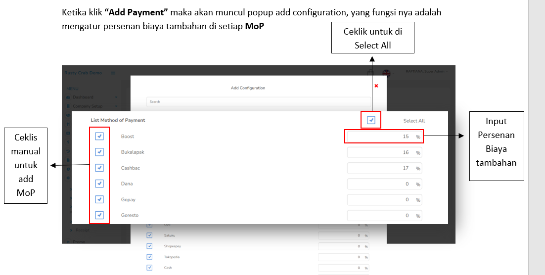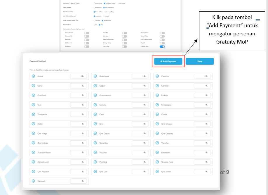 Lakukan Login - Settings – Setup – Payment Method (Banquet ON)