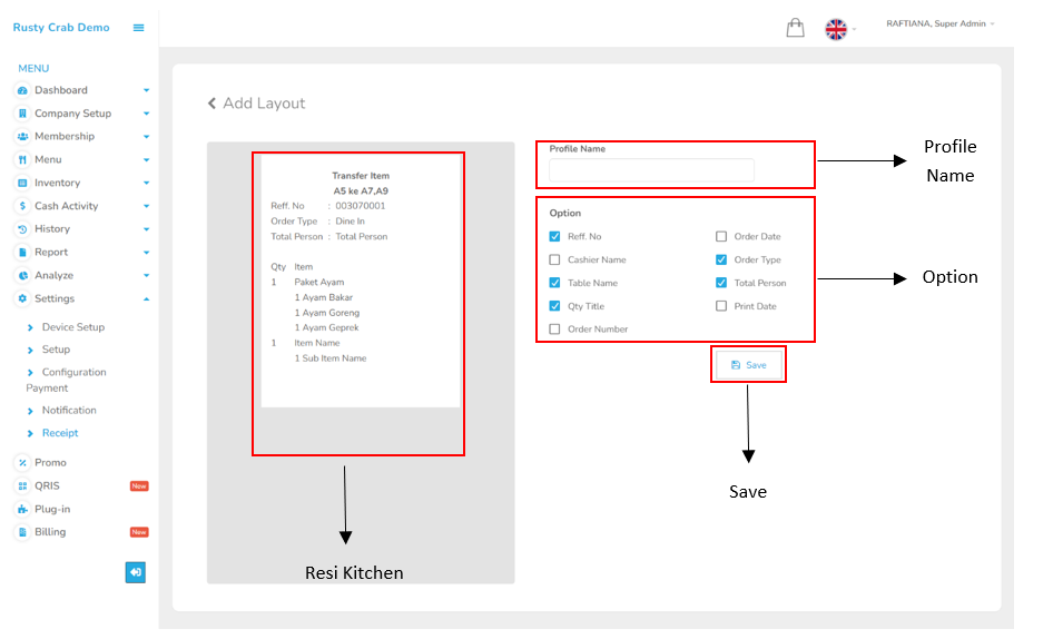 Login – Settings – Receipt – CO Kitchen