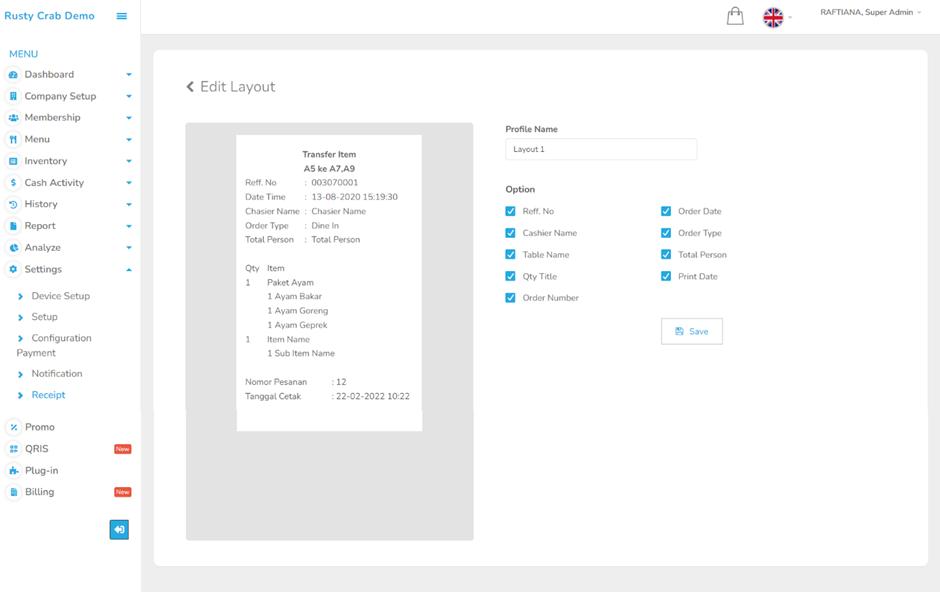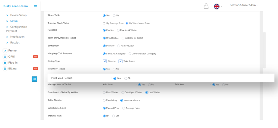 Langkah pertama yang harus di lakukan dalam melihat laporan order by waiter ini adalahMelakukan pengaturan pada menu Setting – Setup seperti berikut :