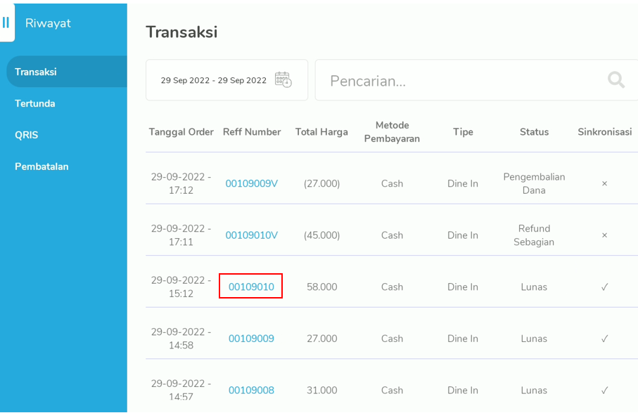 Pada halaman Pemesanan > Grab Connect, akan tampil Tanggal Waktu, Grab Id, Status, dan Total. Klik pada Grab Id, untuk melihat rincian pesanan.