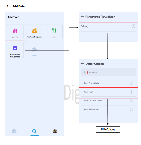 Dalam transaksi di tablet, cabang yang digunakan harus terdaftar menggunakan Plugin DIP Hotel, dengan data transaksi yang di berikan juga adalah data yang diberikan oleh DIP.
