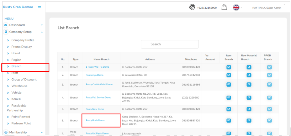 Selain fitur Dashboard yang berfungsi untuk memantau grafik perkembangan penjualan barang Anda, fitur Company Setup pun berfungsi untuk mengetahui identitas perusahaan Anda. Fitur Company Setup terdiri dari "Company Profile", "Promo Display", "Brand", "Region", "Branch", "Staff", "Group of Discount", "Warehouse", dan "Vehicle"Caranya :
